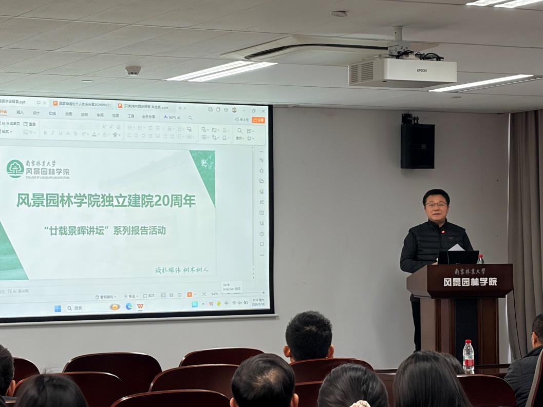 2026年正值风景园林学院独立建院二十周年,1月10日,南京林业大学风景园林学院举办“廿载景晖讲坛”系列学术报告活动。活动聚焦国家基金申报、城市气候适应性规划、竹学基础研究及交叉学科项目论证等前沿议题,特邀三位知名专家学者主讲,为学院师生带来了一场高水平的学术盛宴。学术讲坛由曹加杰副院长主持。