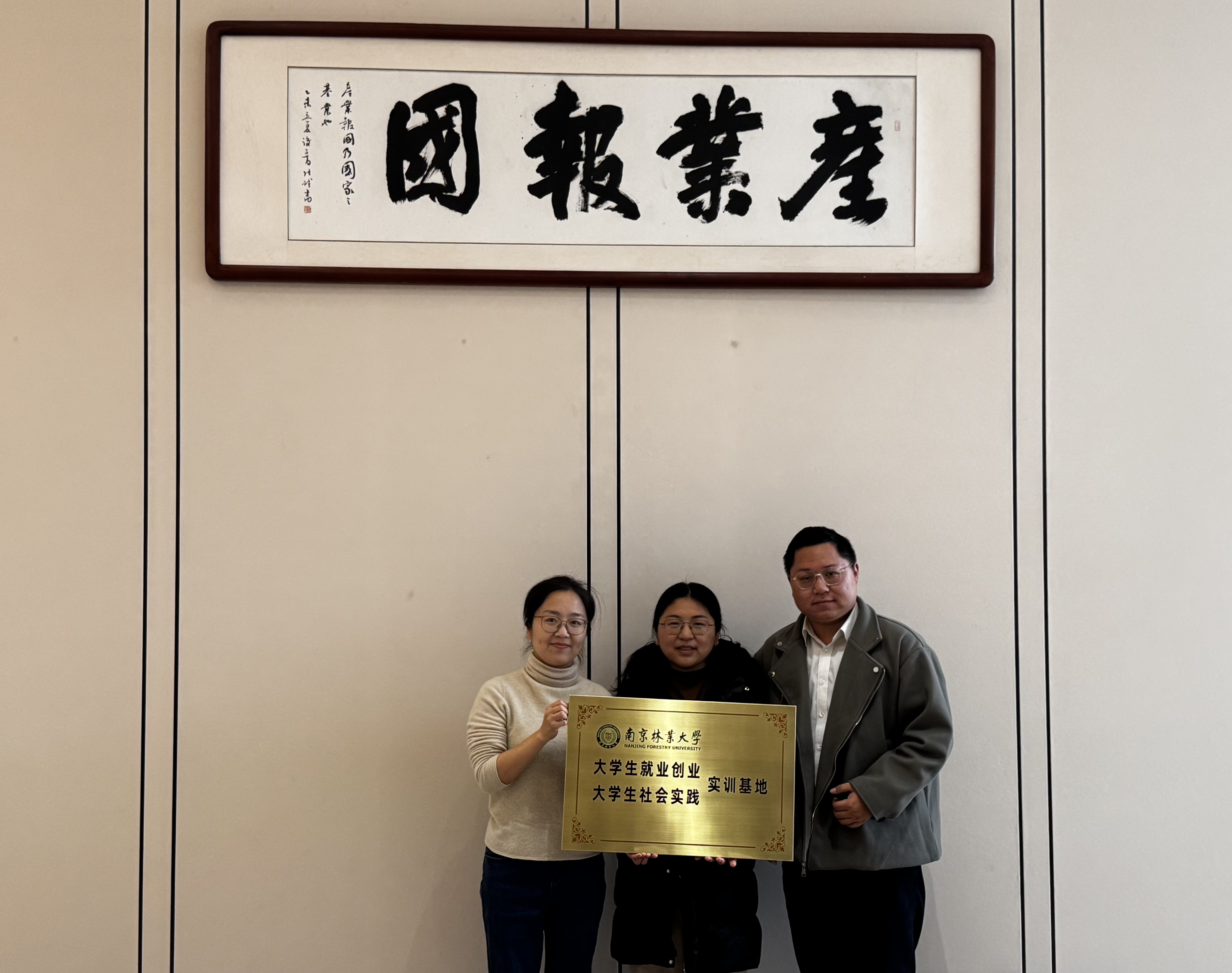 会谈结束后,双方举行授牌仪式。葛云芝代表学院向三一重工授予 “南京林业大学大学生就业创业、大学生社会实践实训基地” 牌匾,标志着双方正式建立长期稳定的合作关系。