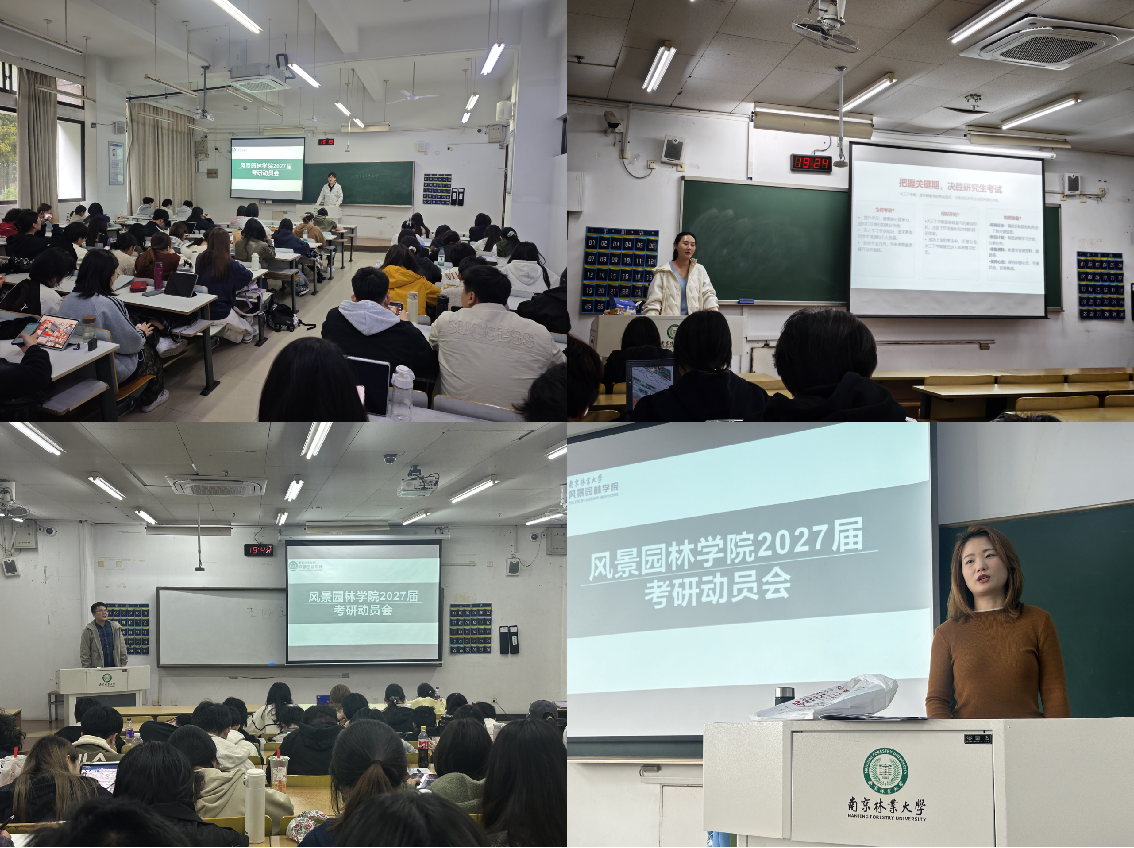 为切实提升2027届本科毕业生核心竞争力、拓宽高质量就业渠道,深化立德树人育人实效,科学引导学生明确升学目标、充分调动考研积极性,4月8日-10日,风景园林学院分班级召开2027届本科毕业生考研动员会。学院领导、辅导员、部分班主任老师及2027届全体本科生分别参加各班级动员会。