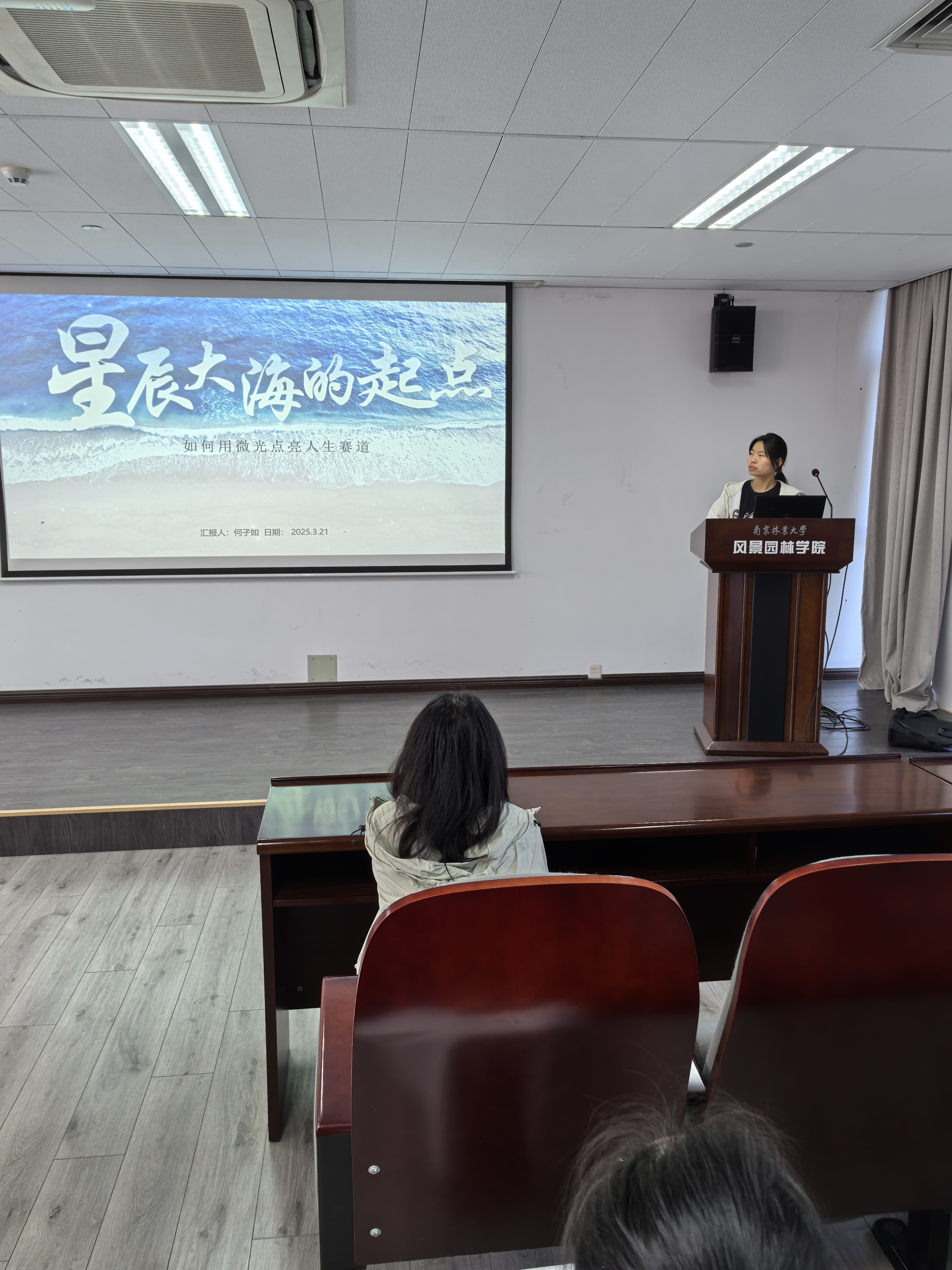 2025年3月21日,南京林业大学风景园林学院“星辰大海的起点—如何用微光点亮人生赛道”梦想公开课在9B301教室举行。何子如同学以“平凡微光的聚能效应”为核心,结合个人成长经历与行业观察,为青年学子破解“宏大理想与具体行动”的衔接密码。