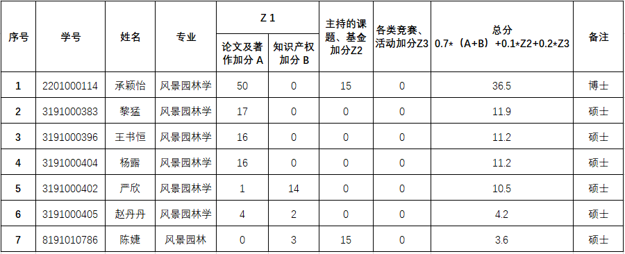 根据《关于开展2021年度研究生国家奖学金评定及报送获奖学生先进事迹工作的通知》的要求和安排,依照《南京林业大学研究生国家奖学金评定暂行办法(修订)》《南京林业大学风景园林学院研究生国家奖学金评定暂行办法(2021)》中的相关规定,经学生个人申请、学院资格认定、申请材料审核、评审委员会集体评审等环节,综合论文专著发表、专利授权、课题主持、科研获奖、竞赛获奖等方面情况,经学院党政联席会议通过,风景园林学院拟推荐承颖怡等1名博士研究生、黎猛等6名硕士研究生作为2021年研究生国家奖学金候选人,现将候选人情况公示。