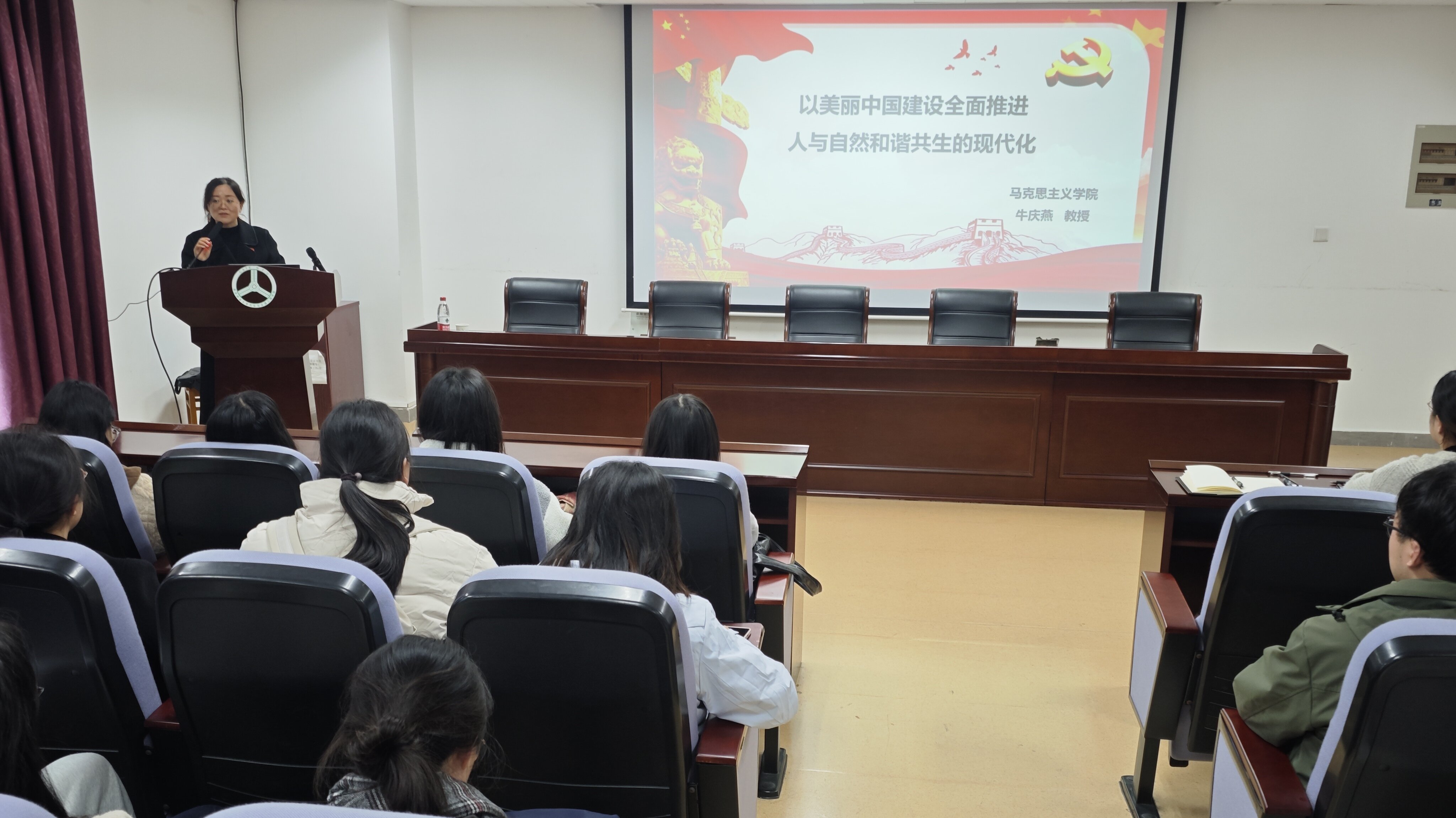为深入学习贯彻习近平新时代中国特色社会主义思想,贯彻落实党的二十届三中全会精神,提高学生预备党员的党性修养。2024年11月20日,学院邀请马克思主义学院院长牛庆燕教授为全体预备党员讲授以“以美丽中国建设全面推进人与自然和谐共生的现代化”为主题的专题党课。